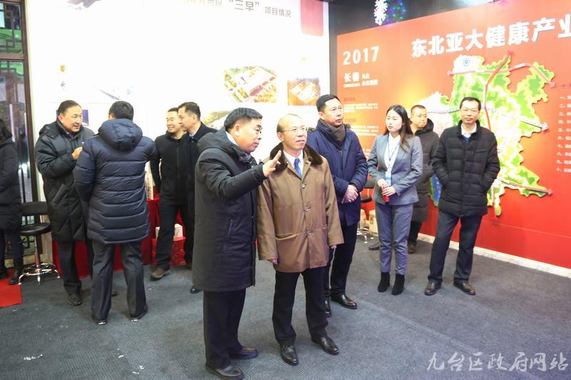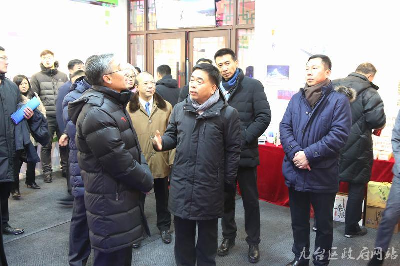 长春市市长刘长龙、副市长张敬安在九台区委常委、常务副区长于海山陪同下到九台区参会展厅进行参观,于海山介绍展厅情况 。