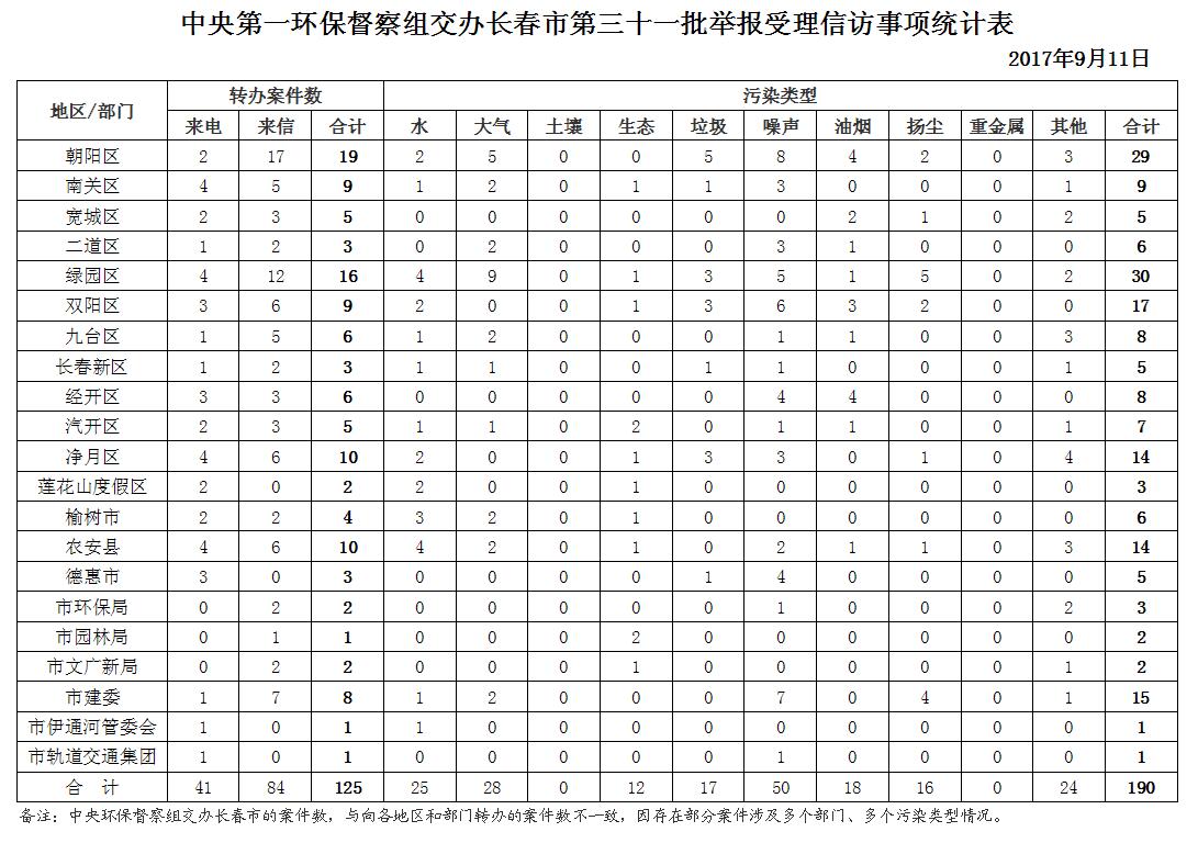 9月11日,中央第一环境保护督察组向长春市交办了第三十一批举报受理信访事项116件(重点案件8件),共涉及190个环境问题。其中涉水问题25个,大气问题28个,生态问题12个,垃圾问题17个,噪声问题50个,油烟问题18个,扬尘问题16个,其他问题24个。共涉及15个县(市)区、开发区和5个市直部门,其中朝阳区19件, 南关区9件,宽城区5件,二道区3件,绿园区16件,双阳区9件,九台区6件,长春新区3件,经开区6件,汽开区5件,净月区10件,莲花山度假区2件,榆树市4件,农安县10件,德惠市3件,市环保局2件,市园林局1件,市文广新局2件,市建委8件,市伊通河管委会1件,市轨道交通集团1件。