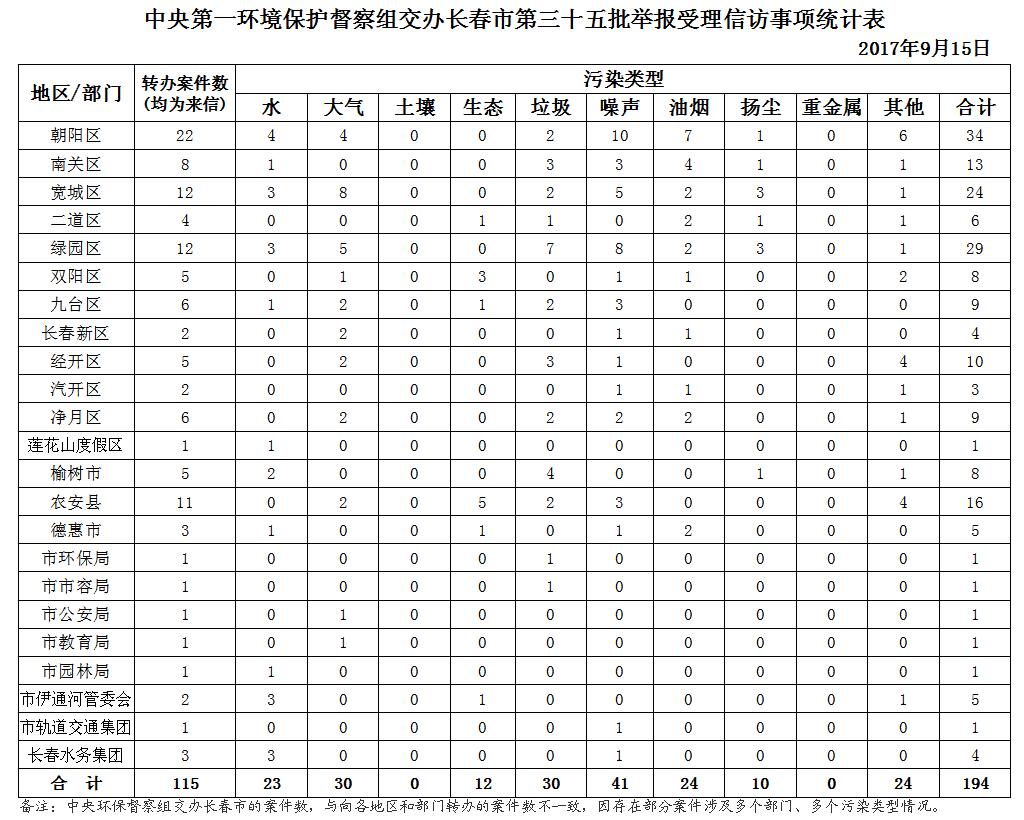 9月15日,中央第一环境保护督察组向长春市交办了第三十五批举报受理信访事项110件(重点案件10件),共涉及194个环境问题。其中涉水问题23个,大气问题30个,生态问题12个,垃圾问题30个,噪声问题41个,油烟问题24个,扬尘问题10个,其他问题24个。共涉及15个县(市)区、开发区和6个市直部门,其中朝阳区22件, 南关区8件,宽城区12件,二道区4件,绿园区12件,双阳区5件,九台区6件,长春新区2件,经开区5件,汽开区2件,净月区6件,莲花山度假区1件,榆树市5件,农安县11件,德惠市3件,市环保局1件,市市容环卫局1件,市公安局1件,市教育局1件,市园林局1件,市伊通河管委会2件,市轨道交通集团1件,长春水务集团3件。
