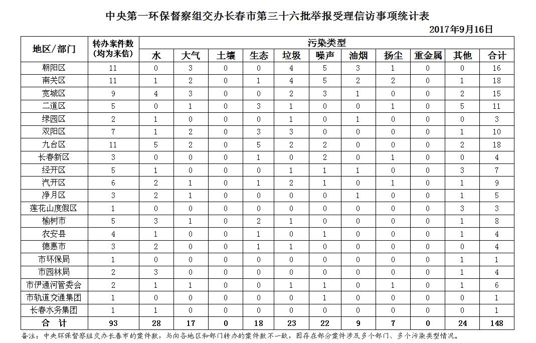 9月16日,中央第一环境保护督察组向长春市交办了第三十六批举报受理信访事项91件(重点案件15件),共涉及148个环境问题。其中涉水问题28个,大气问题17个,生态问题18个,垃圾问题23个,噪声问题22个,油烟问题9个,扬尘问题7个,其他问题24个。共涉及15个县(市)区、开发区和3个市直部门,其中朝阳区11件, 南关区11件,宽城区9件,二道区5件,绿园区2件,双阳区7件,九台区11件,长春新区3件,经开区5件,汽开区6件,净月区3件,莲花山度假区1件,榆树市5件,农安县4件,德惠市3件,市环保局1件,市园林局2件,市伊通河管委会2件,市轨道交通集团1件,长春水务集团1件。