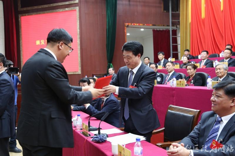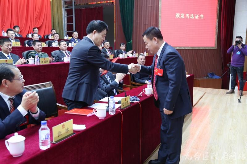 大会主席团常务主席史长友为新当选的长春市九台区人大常委会主任王树民颁发当选证书